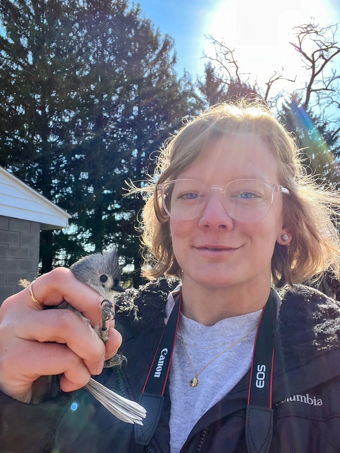 Bird banding is a technique used to track and identify birds. Mist nets are used to trap the birds, which are then gently removed to begin the banding process. First, the bird’s wings and tail feathers are measured to determine age and sex, though some species are visually easier to identify male vs. female (think northern cardinals and American goldfinches) while others must be measured. This information is then recorded in a book that will later be submitted to the Bird Banding Laboratory at the Pautuxent Wildlife Refuge. Next, the bird will receive a small, silver band with a unique nine-digit number. Special pliers are used to attach the ring to the bird’s leg. Fear not! These rings slide easily along the bird’s leg, so they won’t hurt them or interfere with daily life. Once data is recorded and the bird is banded, they are released back into the wild. From personal experience, I can tell you that the birds don’t seem bothered by being handled, banded, and then released. They go on about their day as if nothing happened. However, there is one exception. Tufted titmice always seem inconvenienced and will curse at you (according to Jan, and she is absolutely correct) for disrupting their morning.